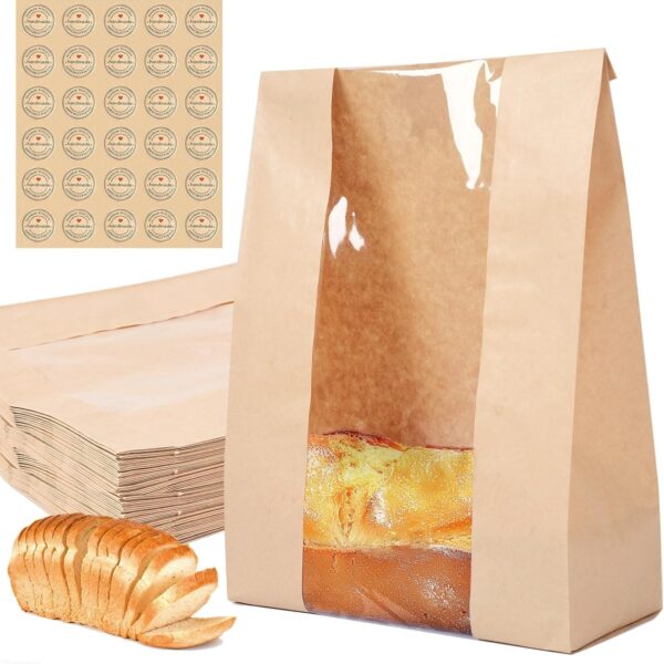 30 pack bread paper bags with window, including 30 homemade bread storage label seal stickers (13.7×8.3×3.5 inches)