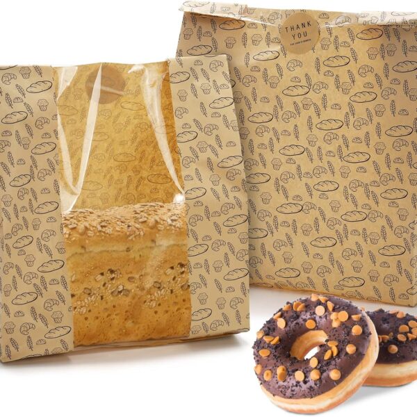 Hacaroa 100 Pack Paper Bread Bags with Clear Window, 10.8″x10″x4″ Kraft Bakery Bag with 100 Stickers, Brown Toast Packaging Bags for Sourdough Bread, Cookie