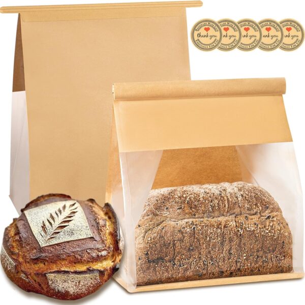 GM HOME 50 PCS Toast Paper Bag Kraft Bread Bag with Front Window Label Seal Sticker Packaging Paper Bakery Bag for Loaf Pastry Cookie Candy