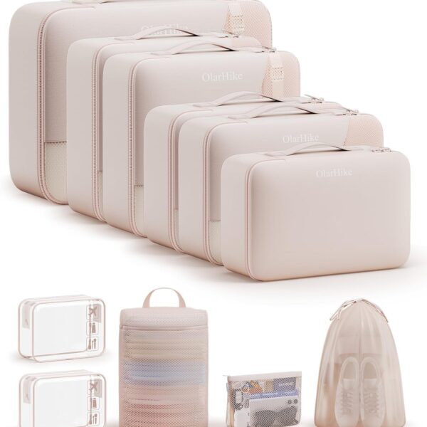 10 Set/8 Set Packing Cubes for Travel, Gifts for Women Mom,Anti-Tearing Suitcase Organizer for Luggage with Shoe & Hanging Toiletry Bag,OlarHike Vacation Essentials & Accessories for Cruise Ship,Cream