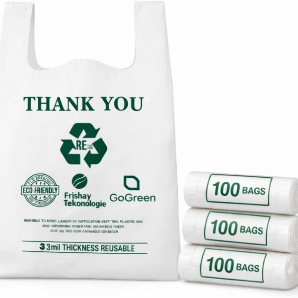 [100 per box] | Recyclable Compostable Reusable Biodegradable Plastic T-Shirt Bags | Grocery Shopping Bags | Green Eco Plastic Bags (100 per Pack) | T-Shirt Carryout Bags 100 count Restaurant Quality, Durable, Reusable and Econ Friendly | Measures 11. 5″ X 6. 25″ X 21″( large size 1/6) , 16 Mic (0. 63 Mil)