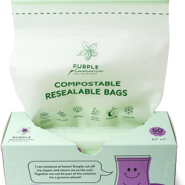 100% Compostable Resealable Food Storage Bags, Biobased, Leak-Proof and Freezer-Safe, Extra Strong & Durable, 50 Count (Quart Size) | Compostable