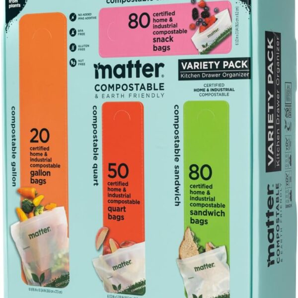 Matter Compostable Assorted Kitchen Bags, 230 Count, Biodegradable, Eco-Friendly Resealable Food Storage Variety Pack, 80 Snack, 80 Sandwich, 50 Quart & 20 Gallon
