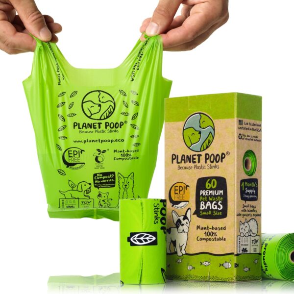 PLANET POOP Home Compostable Dog Poop Bags for Small Pets, 60 Mini Size Dog Waste Bags with Handles, Un-Scented Leakproof Doggy or Cat Bag, Plant Based Pet Supplies
