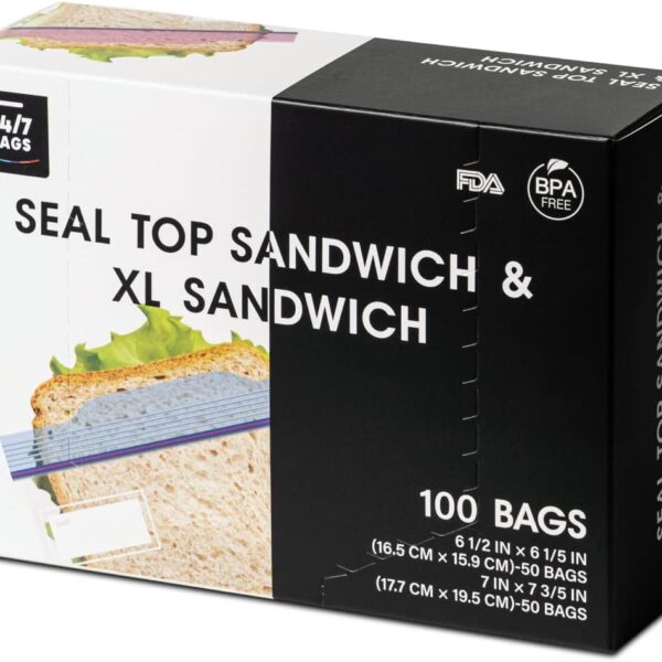 24/7 Bags- Sandwich Storage Bags, 200 Count, Resealable Zipper Bags, Microwave-Safe, BPA-Free, 4 Boxes
