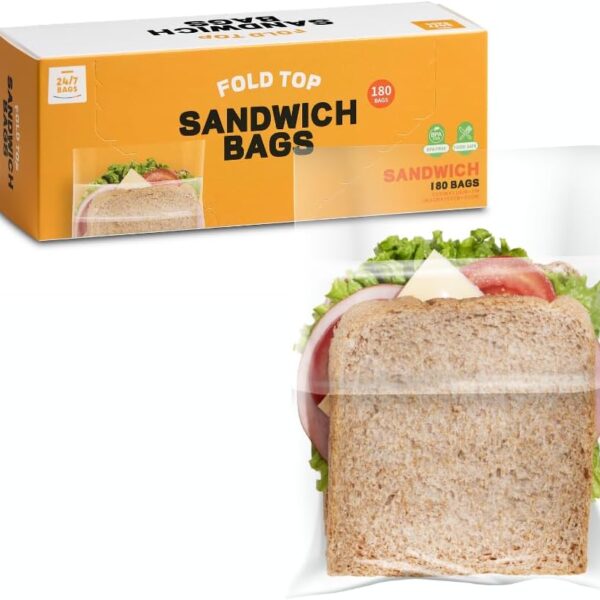 24/7 Bags Fold Top Sandwich Bags, Plastic, 180 Count, Easy To Use, Food Contact Safe