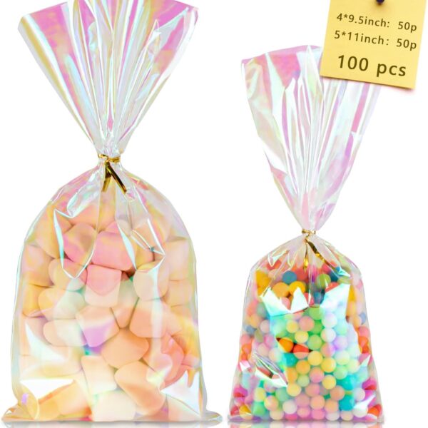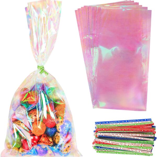Labeol 100pcs Iridescent Cellophane Bags Goodie Candy Gift Bags 5×11 4×9.5 Valentines Day Treat Bags with Ties Clear Holographic Party Favor Wraps Easter Christmas