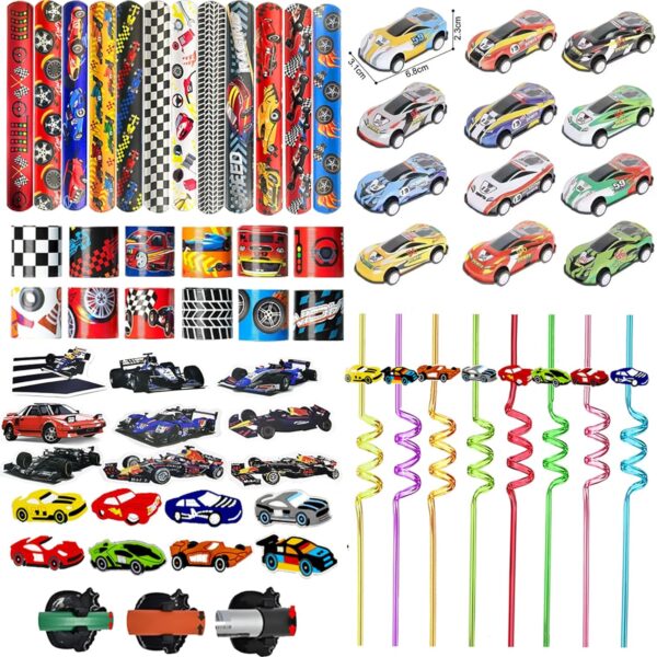108PCS Race Car Party Favors – Themed Birthday Goodie Bags with Party Straws, Bubble Slap Bracelets, DIY Car Stickers, Pencil Caps