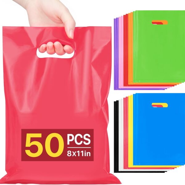 ANZNKU 50 PCS Multicolor Party Favor Bags 8″x11″, Goodie Bag for Candy Jewelry Thank You Treat Craft Easter Eggs, Plastic Gift Bags with Handles for Birthday, Wedding, School Events & Small Business