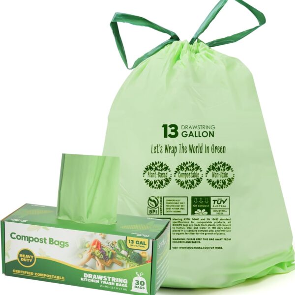 10-13 Gallon Compostable Trash Bags with Drawstring, Heavy Duty Extra Thick 1 Mil, 49.21 Liter, Tear Resistant & Odorless Kitchen Food Scrap Waste Bag, US BPI and OK Compost Home Certified (30 Count)