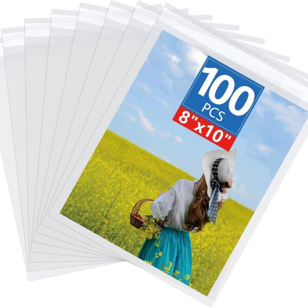 100 Count Acid-Free Clear Plastic Bags, Self Seal Crystal Bags for storaging, Photo Sleeves, Art Prints, Framing Mat, Greeting Cards, Resealable Cellophane Bags – 8″ x 10″