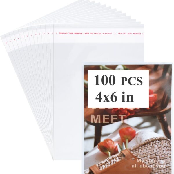 Miraclekoo100Pcs 4-1/2 x 6-1/2 Self Sealing Cello Cellophane Bags Thick Clear Plastic Sleeves – Fit A4 Envelope 4X6 Photos Cards Toploaders Prints Treats Cookie Candy