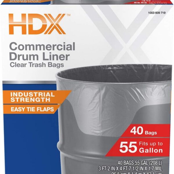 HDX 55 Gallon Clear Heavy-Duty Flap Tie Drum Liner Trash Bags (40-Count)