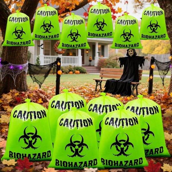 12 Pcs Large Halloween Leaf Bags Biohazard Halloween Decorations Halloween Trash Bags for Leaves Plastic Yard Lawn Waste Bag Scientist Biohazard Bag Outdoor Biohazard Zombie Party Decorations (Green)