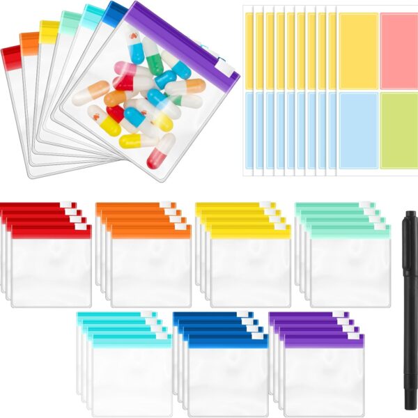 114PCS Travel Pill Organizer – RAINFLOW Bpa Free Pill Bags for Travel, Pack of 50 Clear Label Writing Baggies 50 Mylar Bags 7 Colors Small Ziplock Bag 7 Pill Box AM PM Supplements Baggies