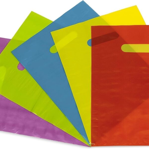 Prime Line Packaging Plastic Gift Bags, Party Favor Bags with Handle, 1.25 Mil Die Cut, Small Business, Holidays, Goodies, Shopping, Multi-Color, Bulk, 9×12, 100 Pack