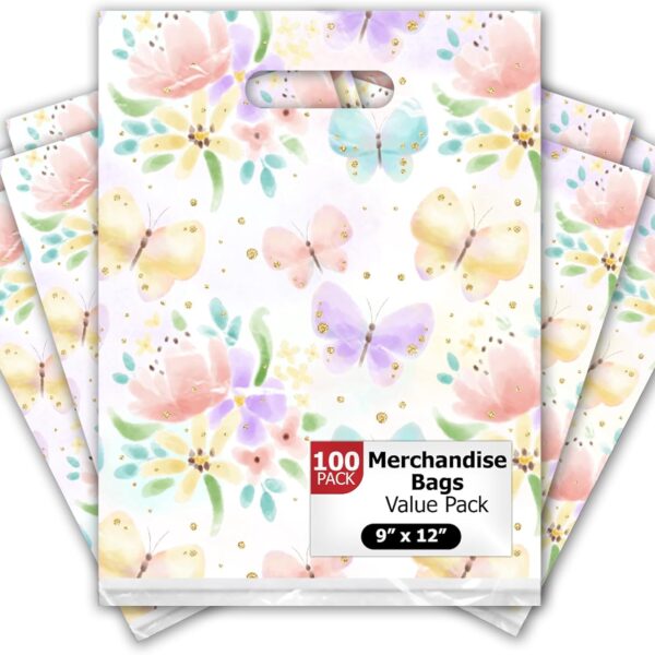 Pro Supply Global 9×12 100 Count Floral Butterfly Designer Retail Boutique Merchandise Bags with Die Cut Handles Premium Printed Shopping Bags For Small Business Shop Owners
