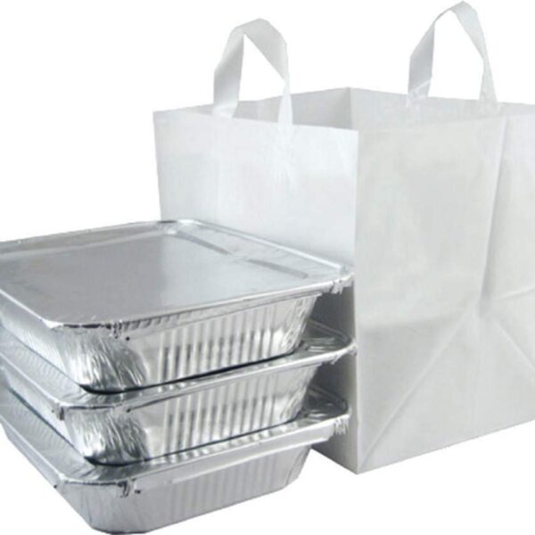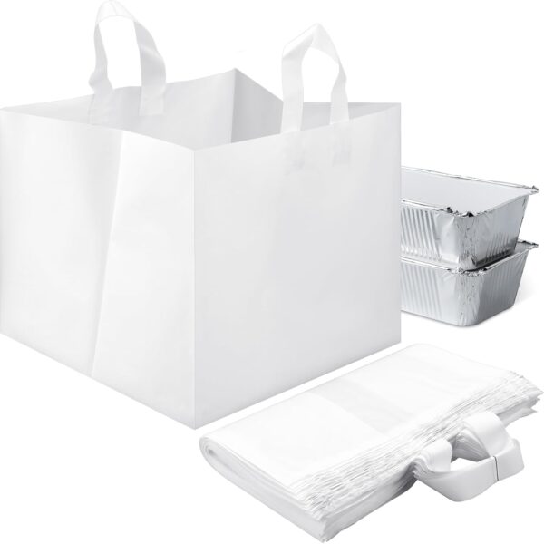 200 Pcs 14″ x 11.5″ x 12″ Half Tray Catering Bags Take Out Bags with Cardboard Bottom and Soft Loop Handles for Restaurant, Retail, Business, White