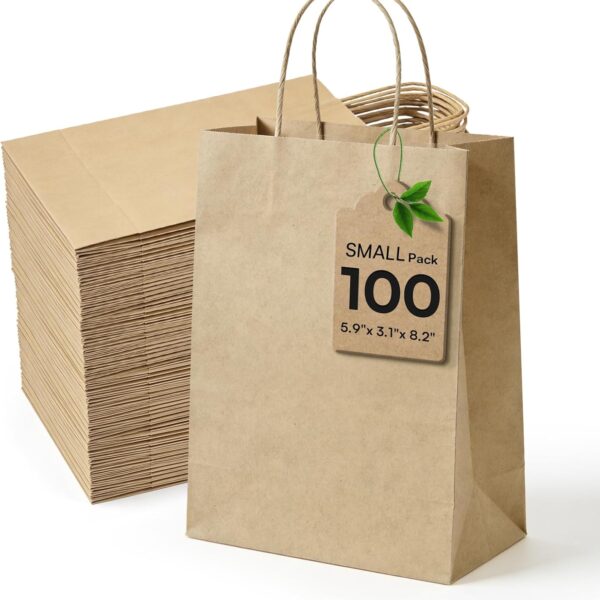 Small Paper Gift Bags with Handles Brown Paper Bags 100 pcs 5.9″x3.1″x8.2″,Sturdy Small Gift Bag Bulk Kraft Wrap Shopping Bags for Small Business Retail Merchandise Wedding Birthday Goodie Party Favor