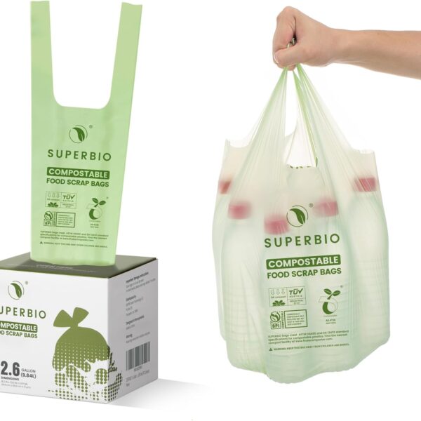 SUPERBIO 2.6 Gallon Compostable Bags with Handles, 100 Count,1 Pack, Food Scrap Bags Certified by BPI and OK compost INDUSTRIAL, 9.84L