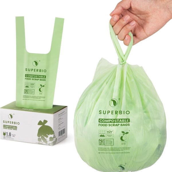 SUPERBIO 1.6 Gallon Handle Tie Compostable Food Scrap Bags For Counter Top Compost Bin, Small Compost Bags, 50 Count, 6 Liter, BPI & OK compost INDUSTRIAL Certified
