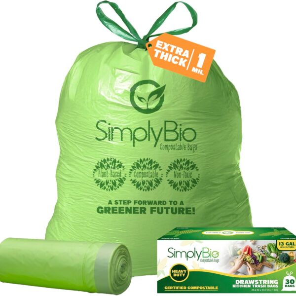 Simply Bio 13 Gallon Compostable Trash Bags Liners Drawstring, Heavy Duty Extra Thick 1 Mil, 49.21 Liter, 30 Bags, Tall Kitchen Food Scrap Waste Bag, ASTM D6400, US BPI and OK Compost Home Certified