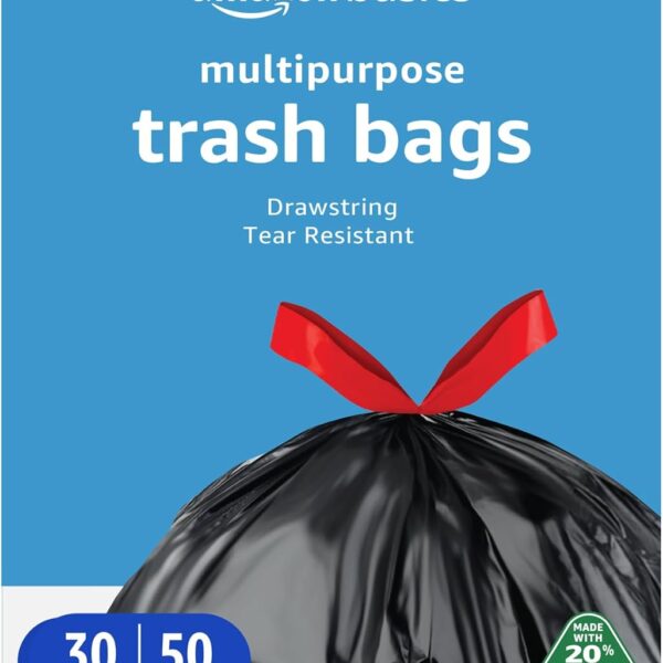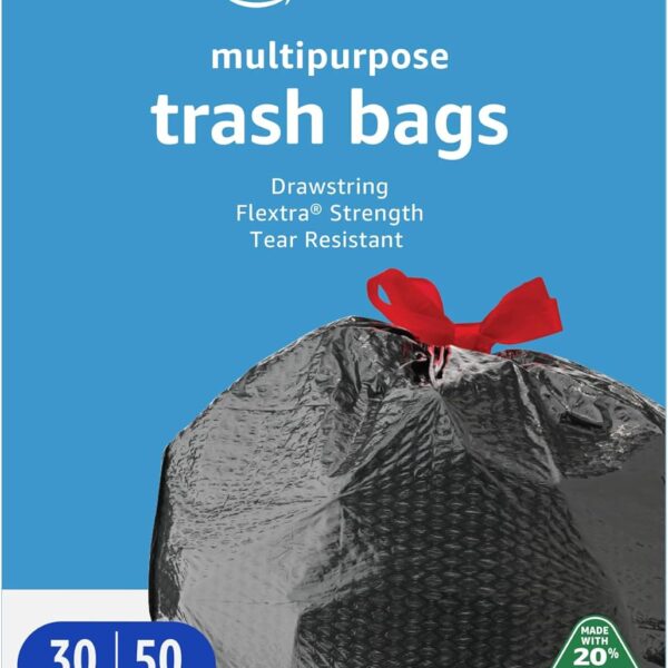 Amazon Basics 30 Gallon Flextra Strength Multipurpose Drawstring Trash Bags, 20% Post Consumer Recycled Material, Tear Resistant, Black, 50 Count