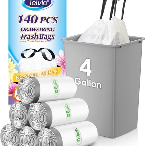4 Gallon 140 Counts Strong Drawstring Trash Bags Garbage Bags by Teivio, Bathroom Trash Can Bin Liners, Small Plastic Bags for home office kitchen, White