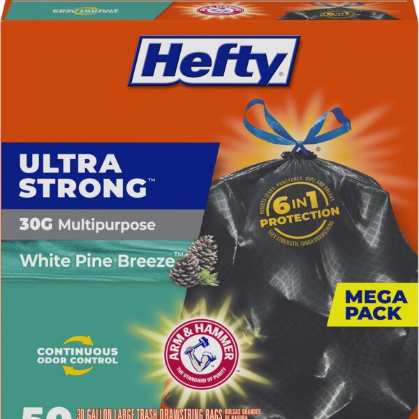 Hefty Ultra Strong 30 Gallon Trash Bags, Large Trash Bags 30 Gallon Size, Multipurpose, Break Resistant Drawstring Closure, Resists Leaks, Punctures, and Tears, Black, White Pine Breeze Scent, 50 Bags