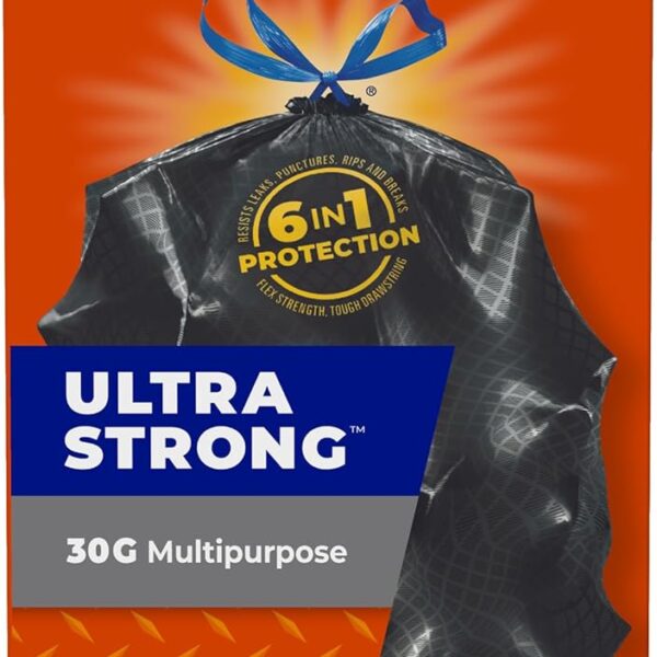Hefty Strong 30 Gallon Trash Bags, Large Trash Bags 30 Gallon Size, Durable Drawstring Enclosure, Resists Punctures, Leaks, and Tears, Black, Unscented, 56 Bags