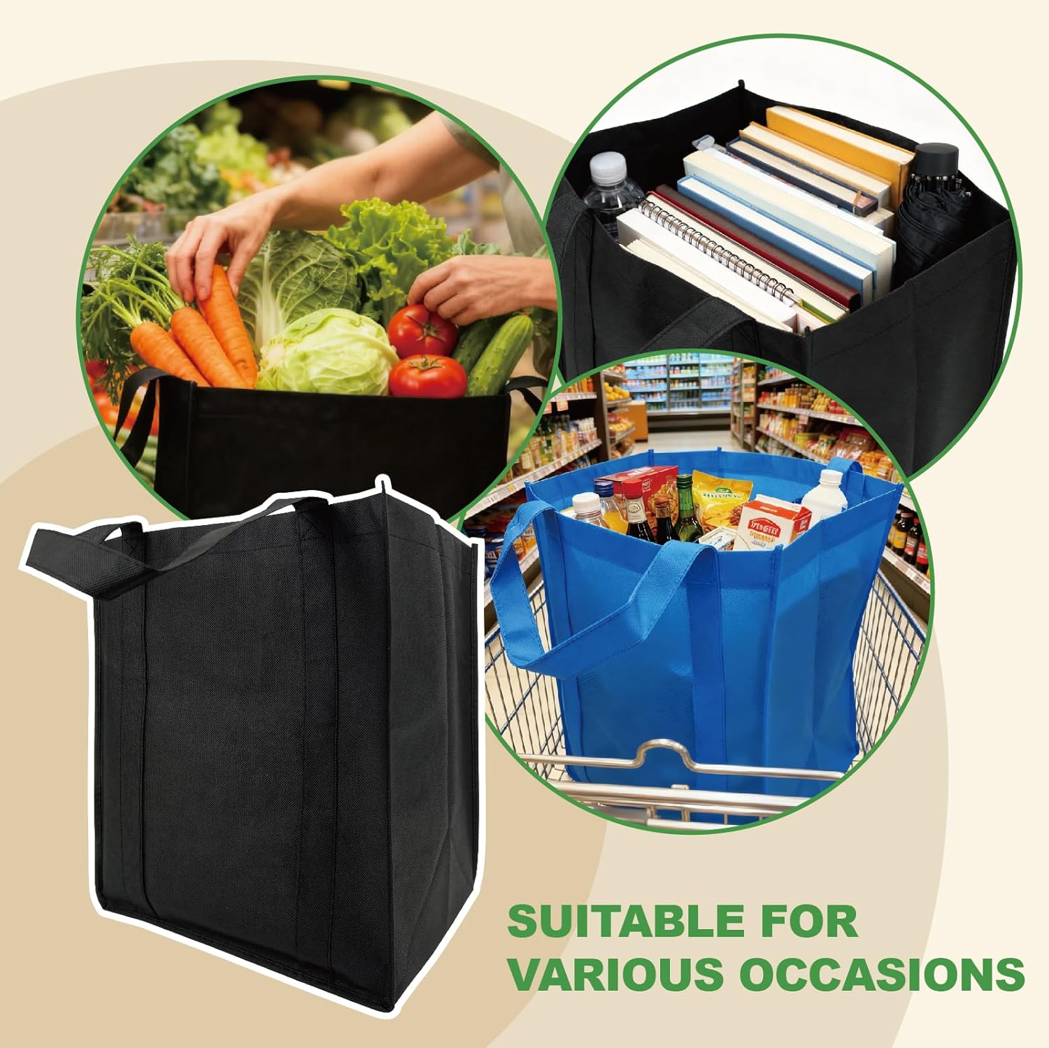 Reusable:Our reusable grocery bags are crafted from eco-friendly recycled non-woven fabric,as a sustainable replacement for single-use plastic bags, these reusable shopping bags help protect the environment.