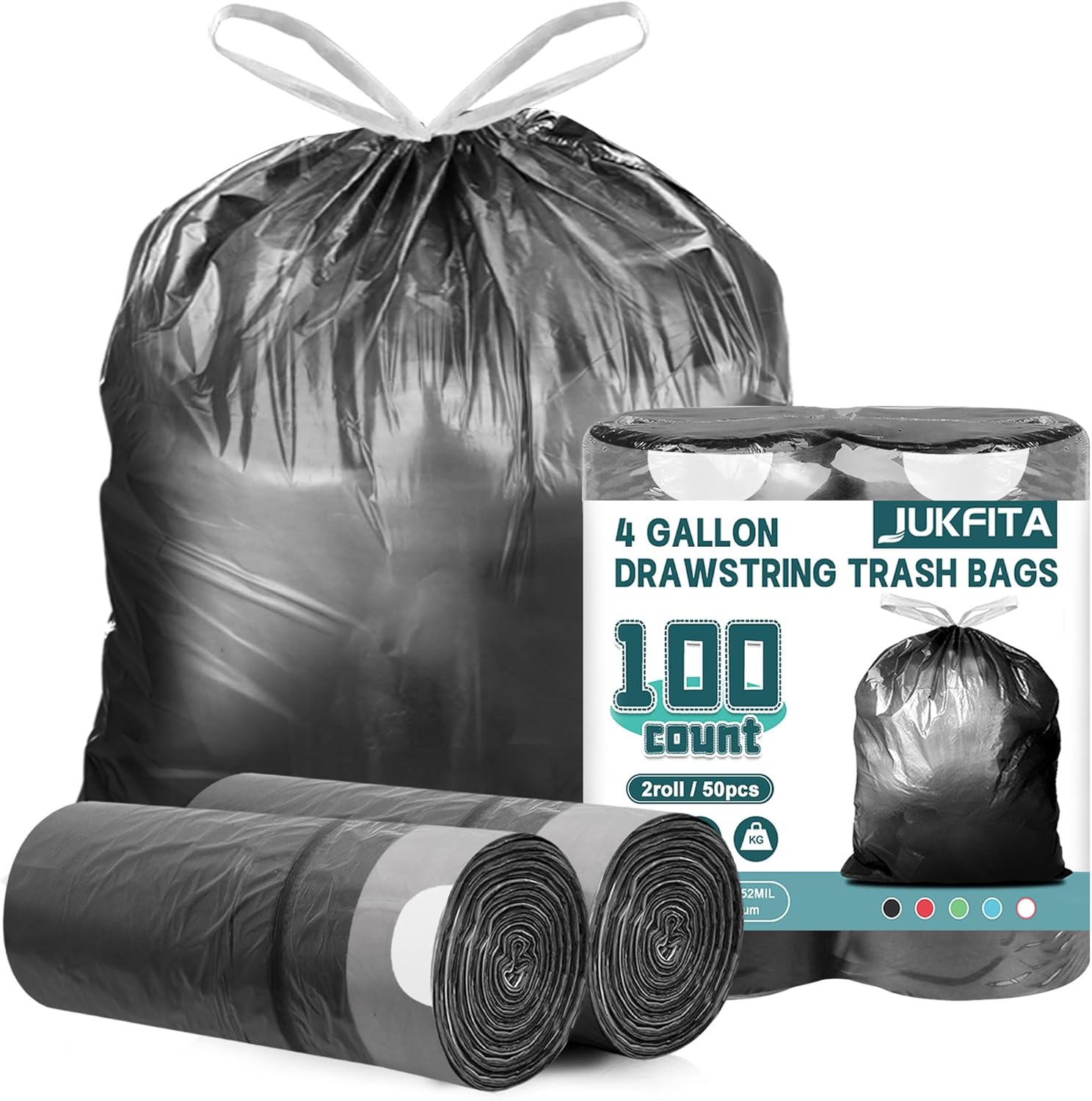 100 Count Small Trash Bags, JUKFITA 4 Gallon Trash Bags Drawstring, Black Small Garbage Bags for Bathroom Kitchen Office Bedroom, Unscented