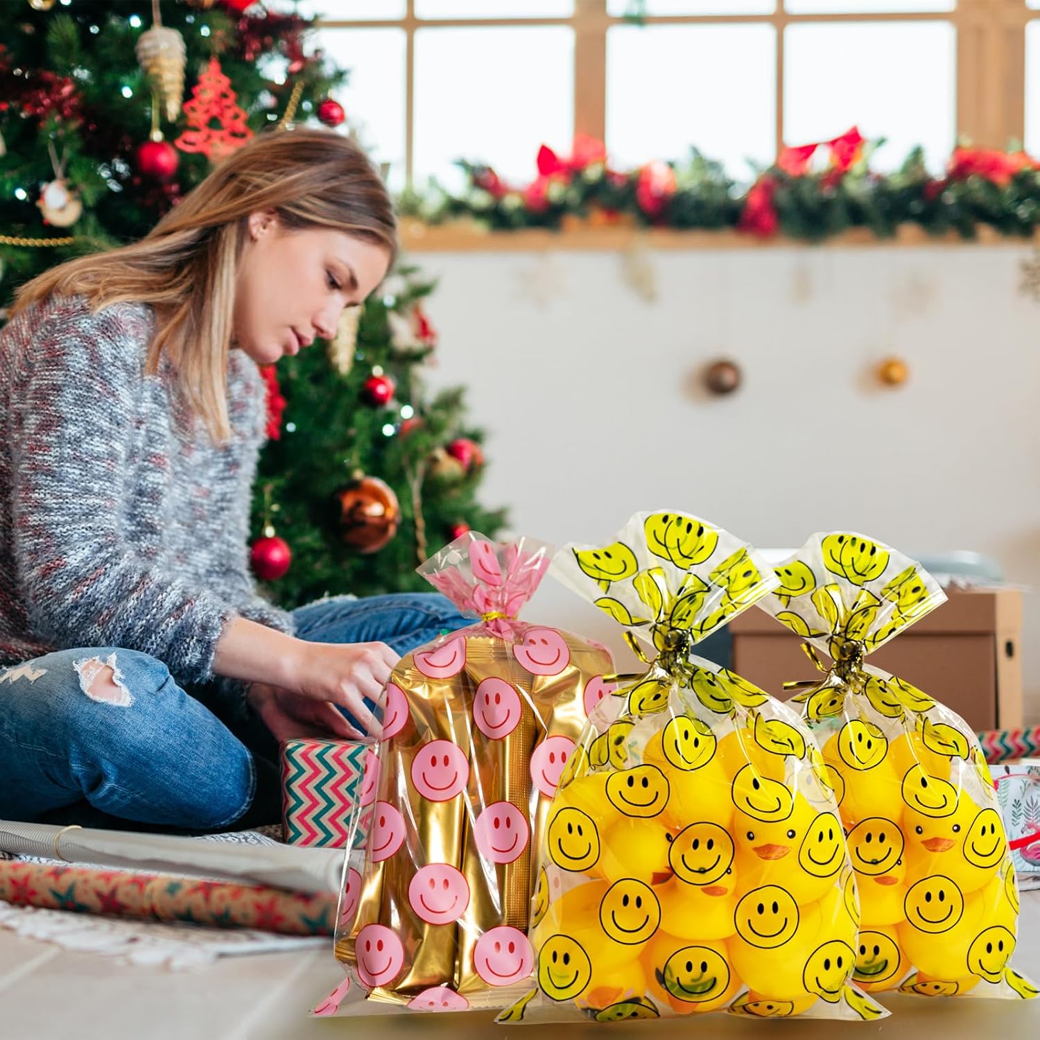 100 Pack Goodie Bags with Ties for Bulk Use – Includes 100 goodie bags (yellow & red happy face designs) with matching twist ties, ideal for high-volume treat bags, party supplies, giveaways, and event packaging needs