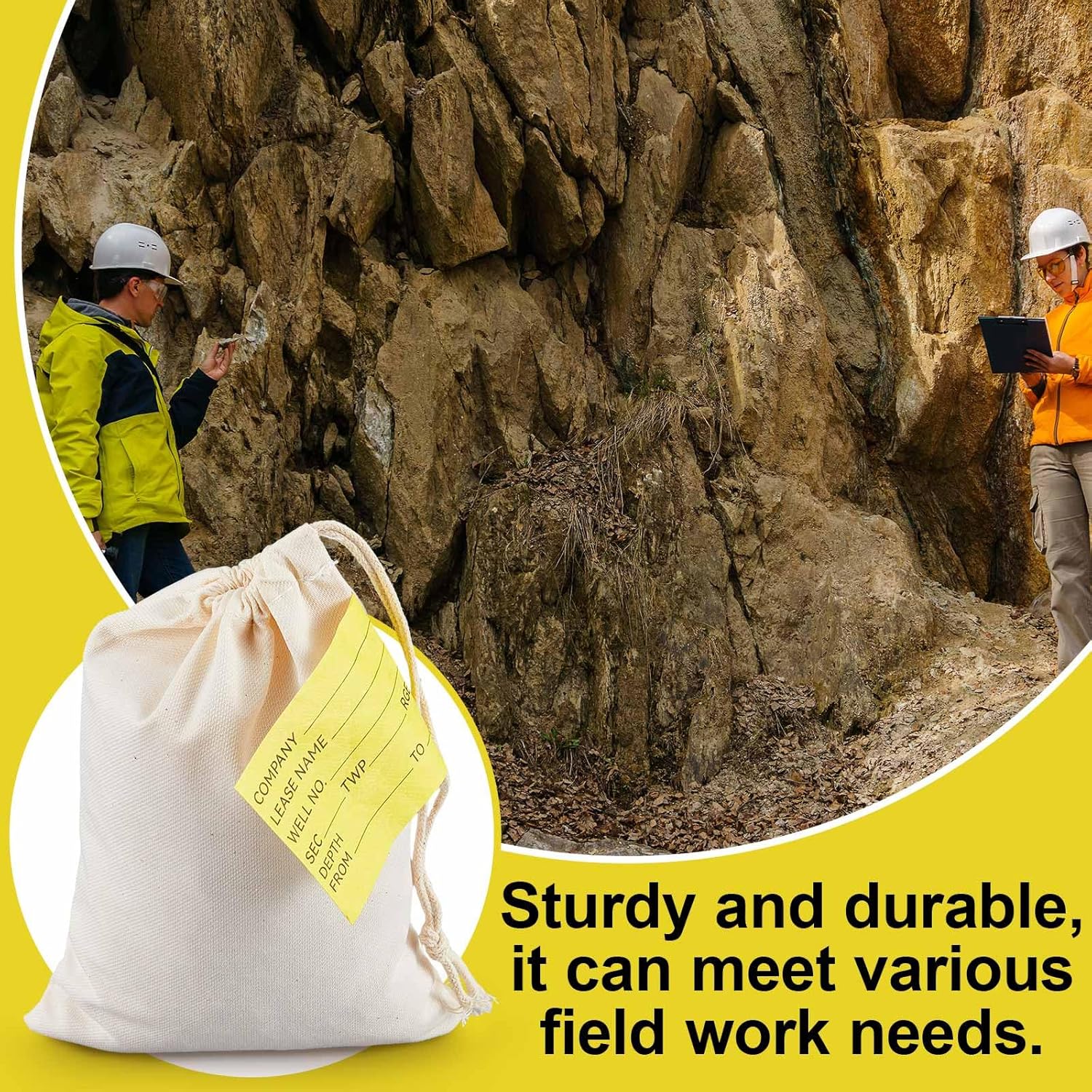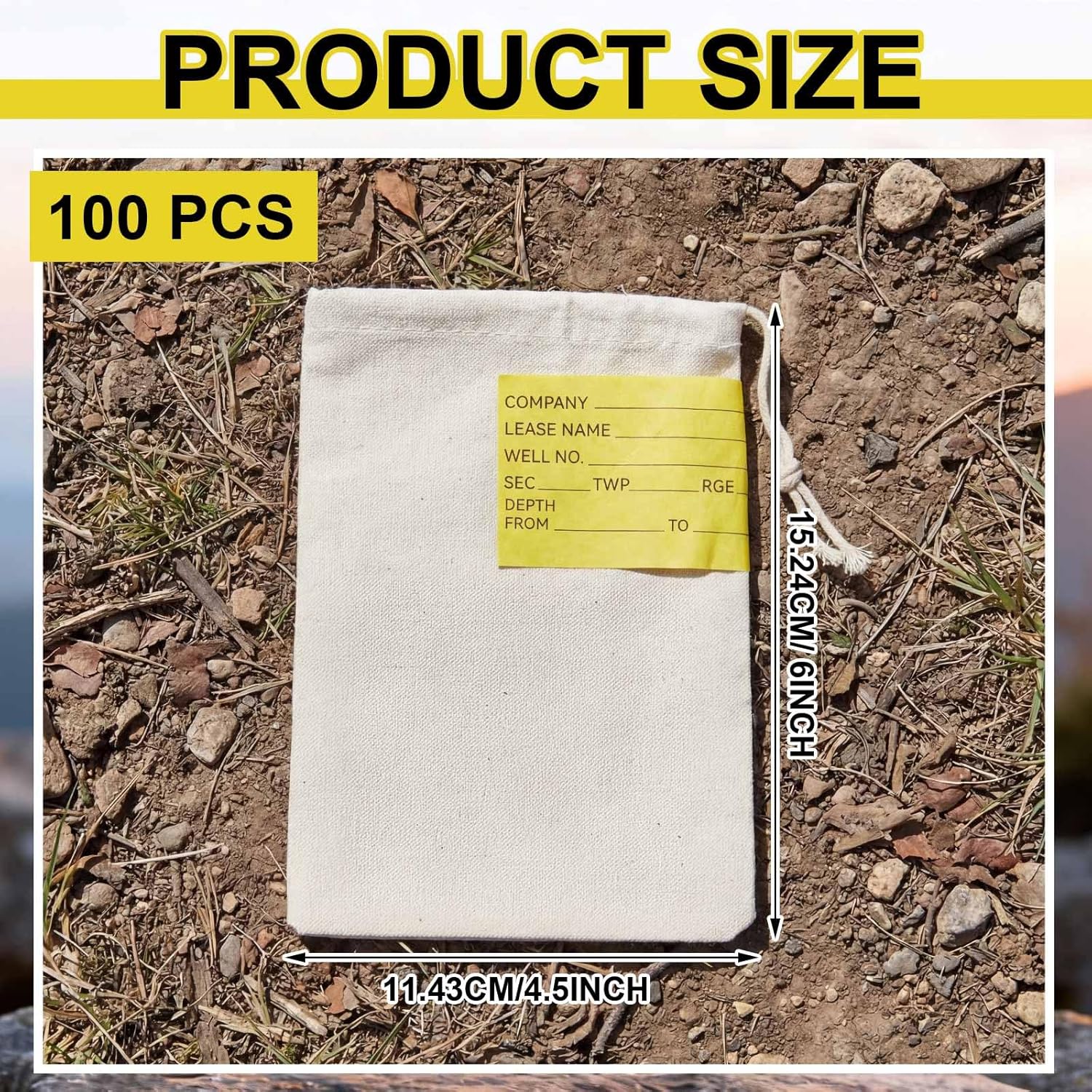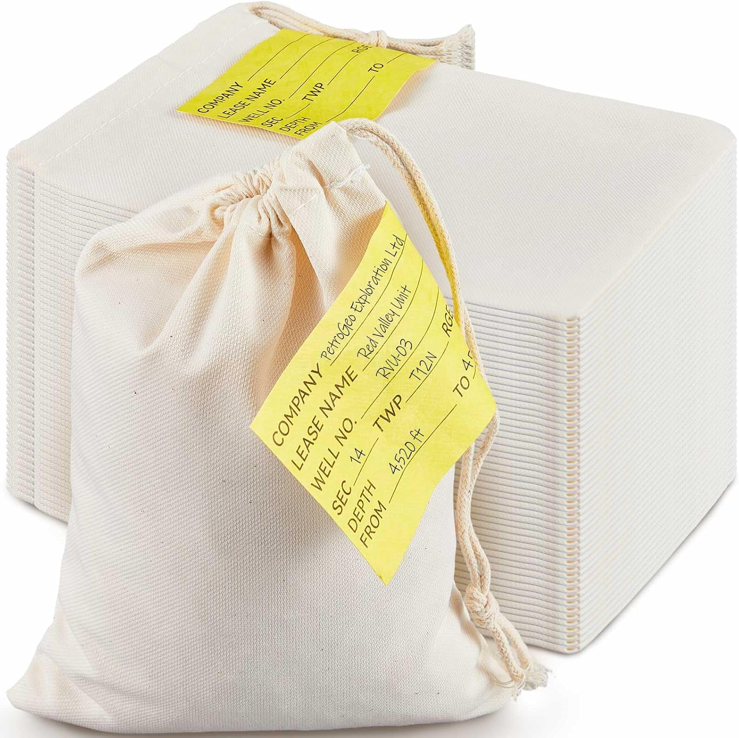 100 Pcs Geological Sample Bags, 4.5″ x 6.2″ Washable Yellow Tag, Fabric Drawstring