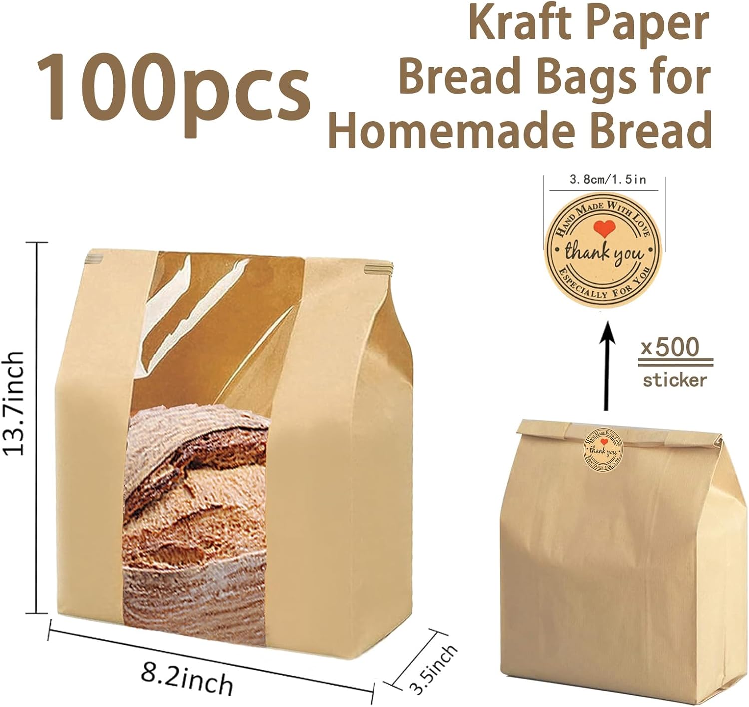 100 Pcs(13.7×8.2×3.5 in) Paper Bread Bags for Homemade Bread, Sourdough Bread Bags with Window, Sourdough Storage Bags for Bread Packaging includes 500 Cute Seal Stickers
