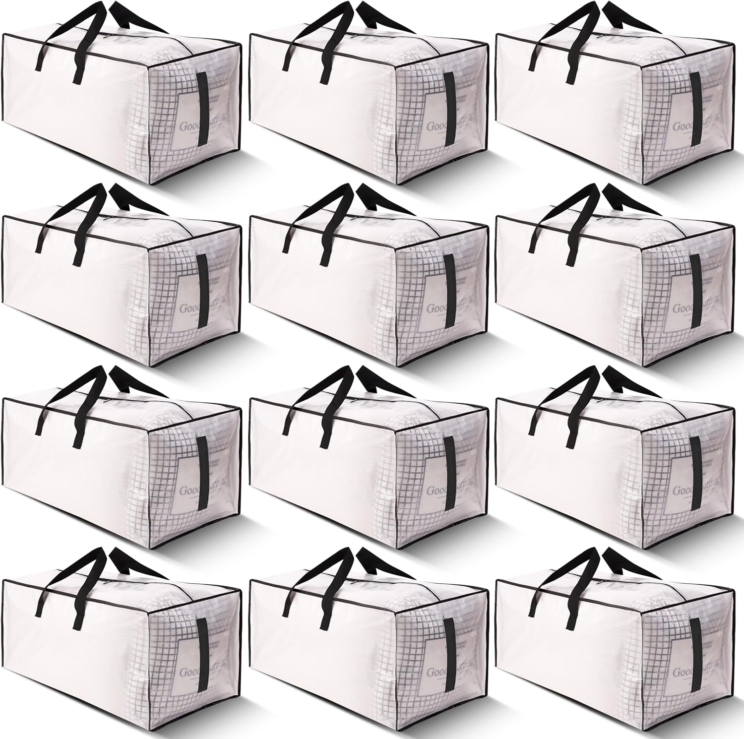 12 Pack Large Strong Moving Bags with Zippers & Carrying Handles – Water-Resistant – Heavy Duty Storage Tote for Space Saving, Fold Flat, Alternative to Moving Box (Semi-Transparent)