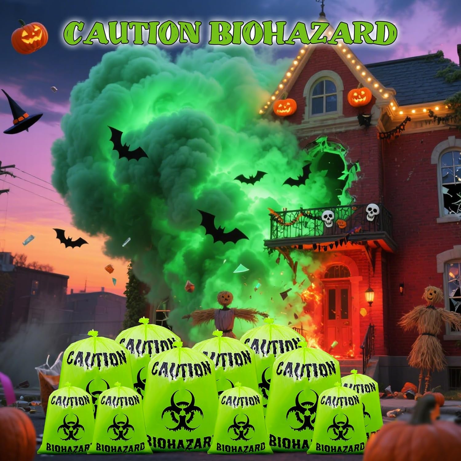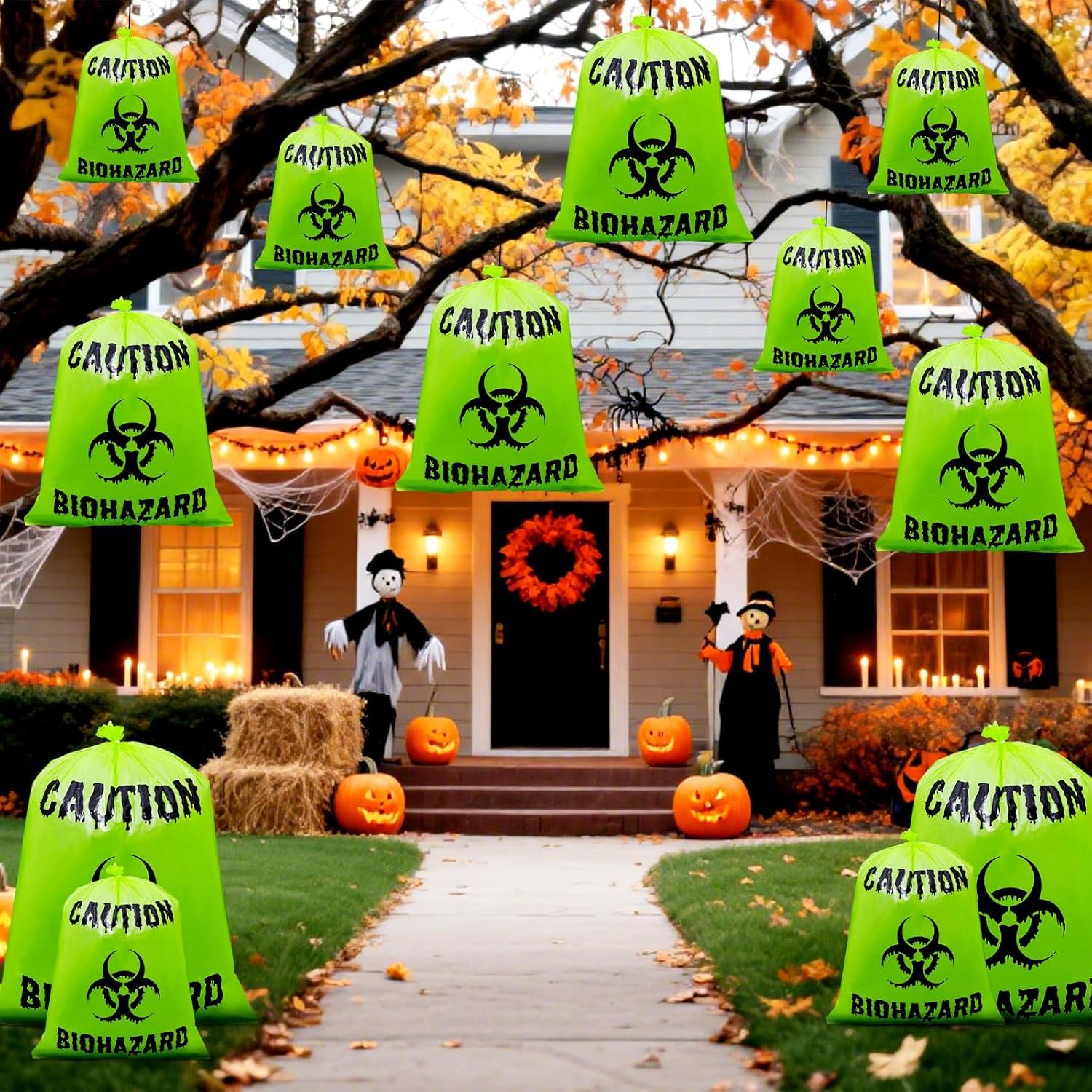 12 Pcs Large Halloween Leaf Bags Biohazard Halloween Decorations Halloween Trash Bags for Leaves Plastic Yard Lawn Waste Bag Scientist Biohazard Bag Outdoor Biohazard Zombie Party Decorations (Green)