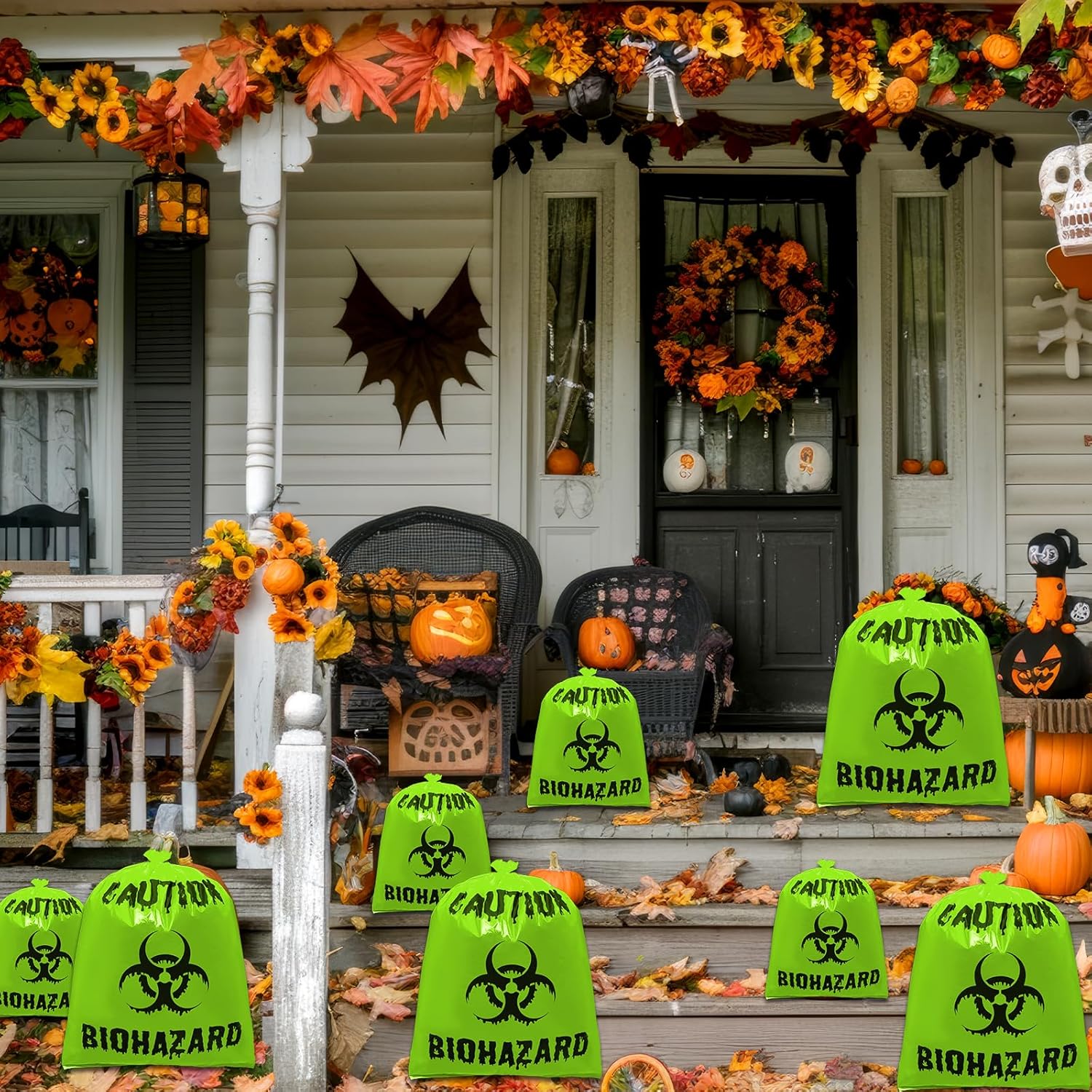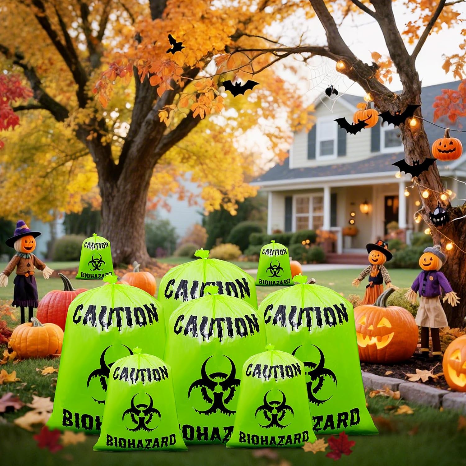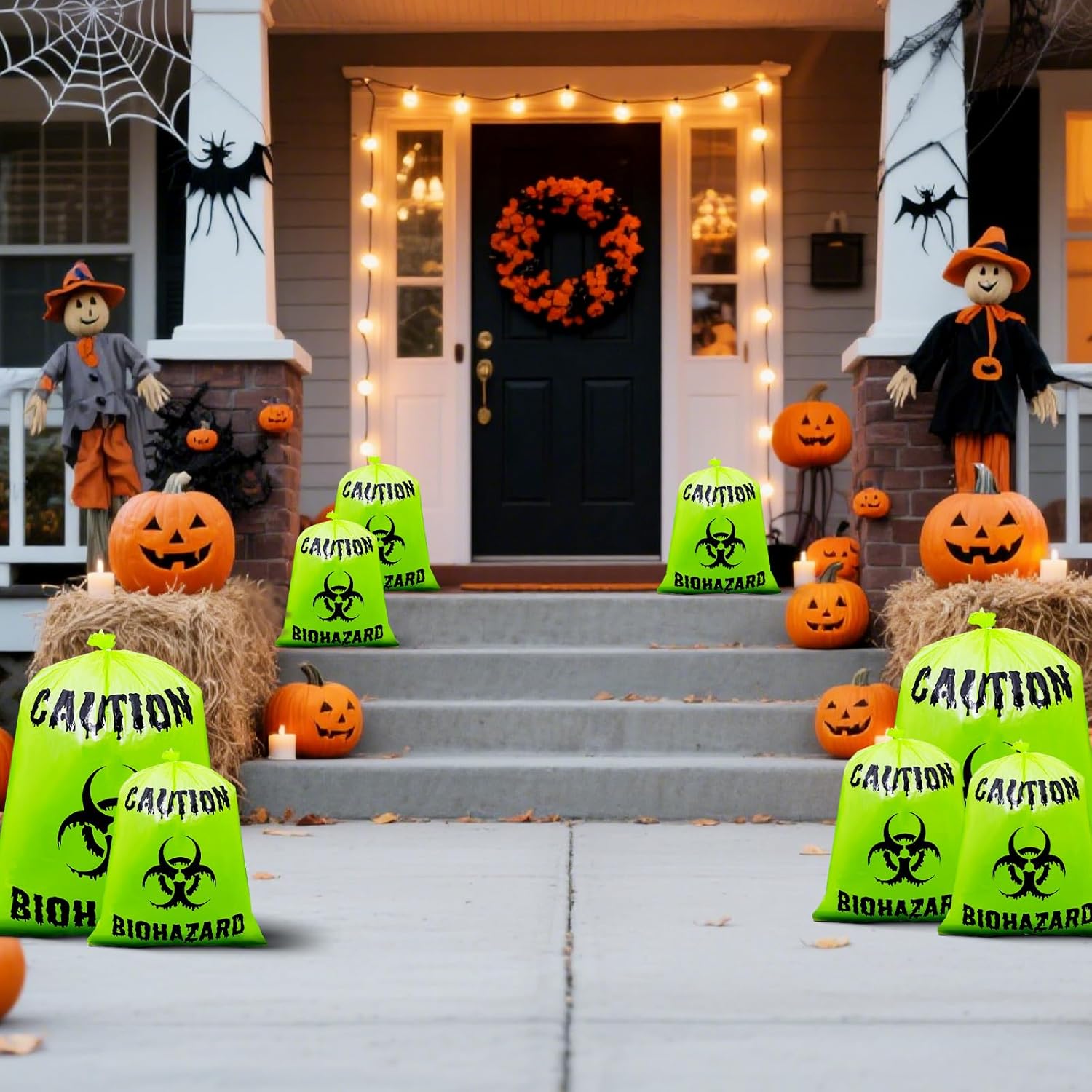 Versatile Halloween Applications: Beyond use as yard lawn leaf bags, they excel in Halloween biohazard-themed party decorations and decor. Use them to hold party props like fake spiders or skeletons, leveraging biohazard symbol print to amplify the spooky atmosphere.Also serve as Halloween party favors outdoor decorations elements – hang them on porches or walls to inject extra creativity and fun into your Halloween celebrations