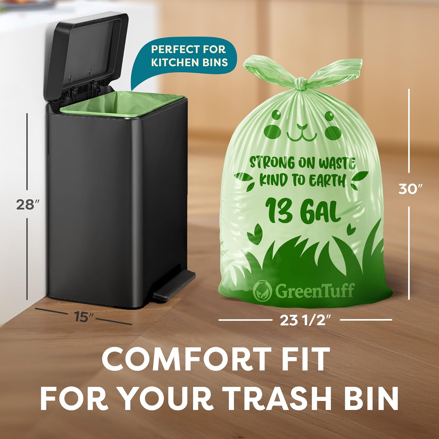 FIT FOR TALL KITCHEN TRASH CANS: 13-gallon compostable garbage bags (also searched as compostable trash bags 13 gallon) designed as a tall kitchen trash can liner / bin liner for standard 13-gallon cans (30″ H × 23.5″ W lay-flat). Not sized for small countertop compost pails.