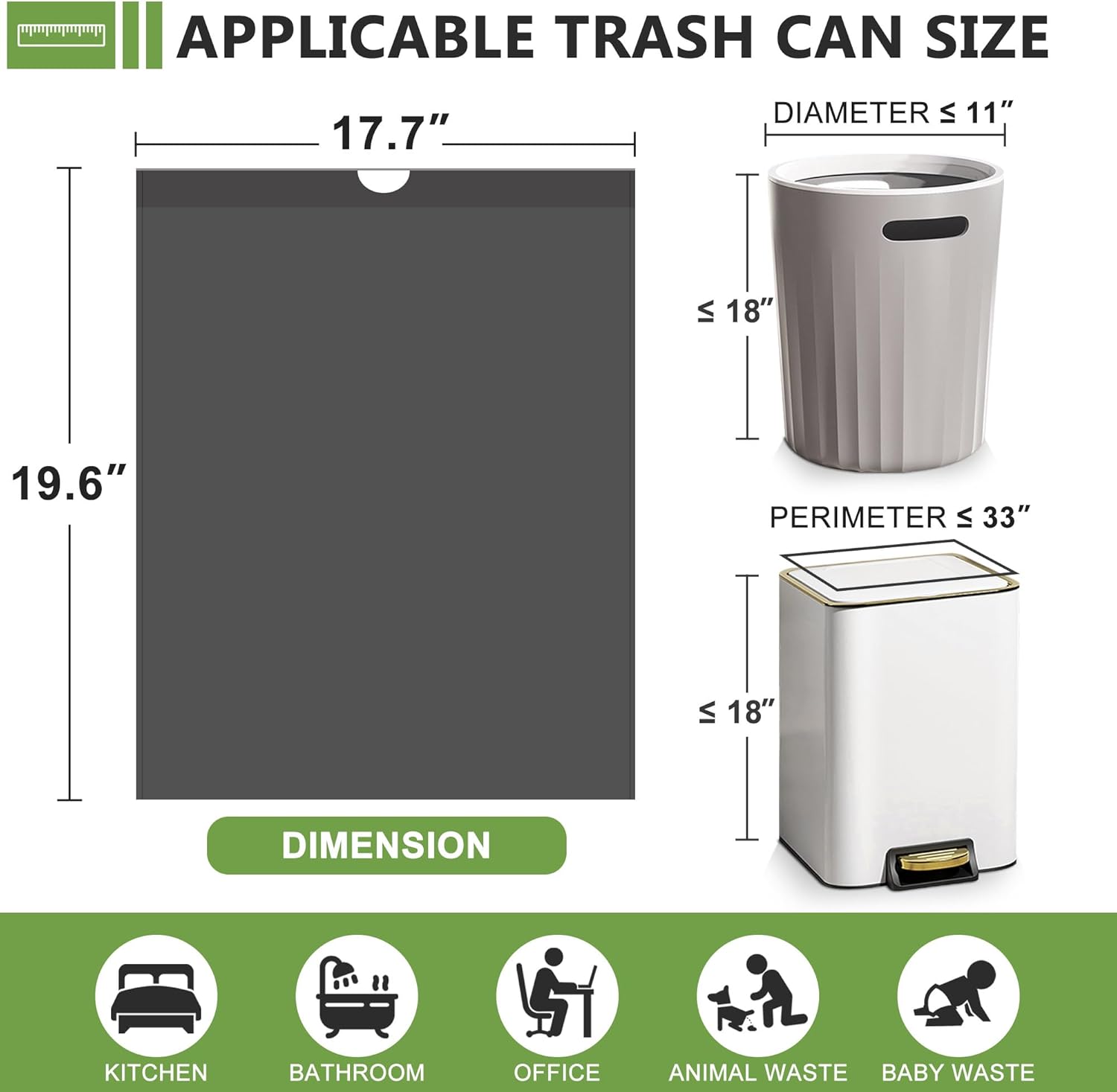 【For 4 Gallon Trash Cans】Trash bags 4 gallon sizes are 19.68″*17.71″. Make sure your trash can is <11" in diameter or <33" in circumference before buying. If the height is > 18″, the bag will not fit in your trash can.