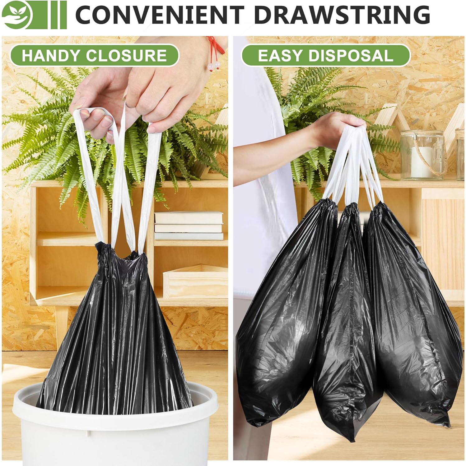 【4 Gallon Trash Bags Drawstring】 Sturdy drawstring trash bags make packing trash easier. So you don’t have to reserve packing space. Even if the bin is full, the trash bag can be closed and lifted with a drawstring around the edge.