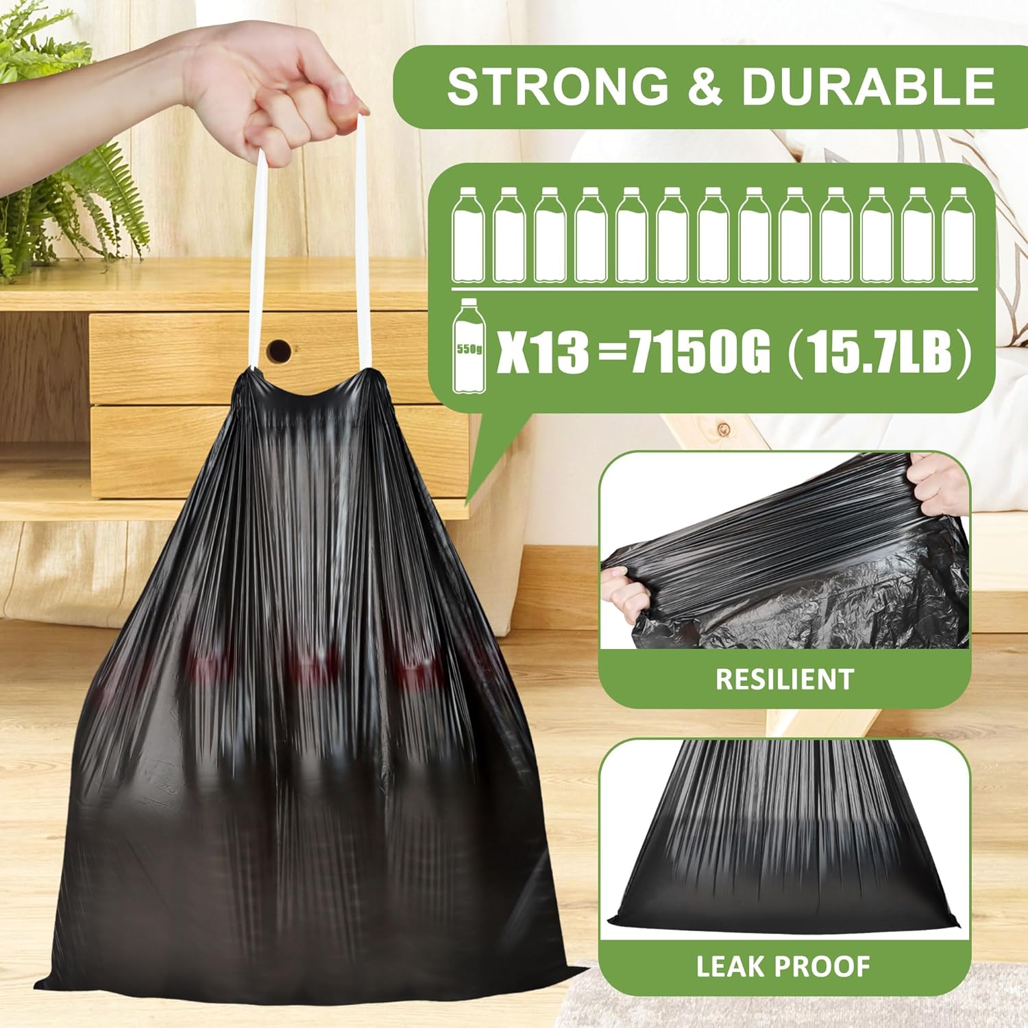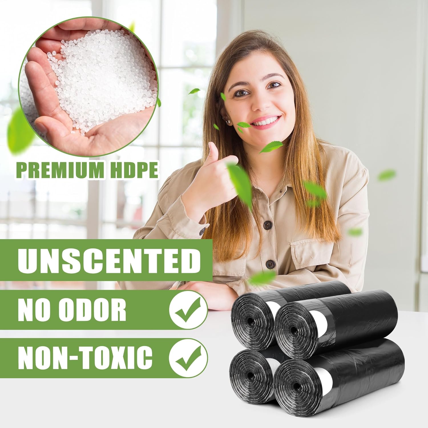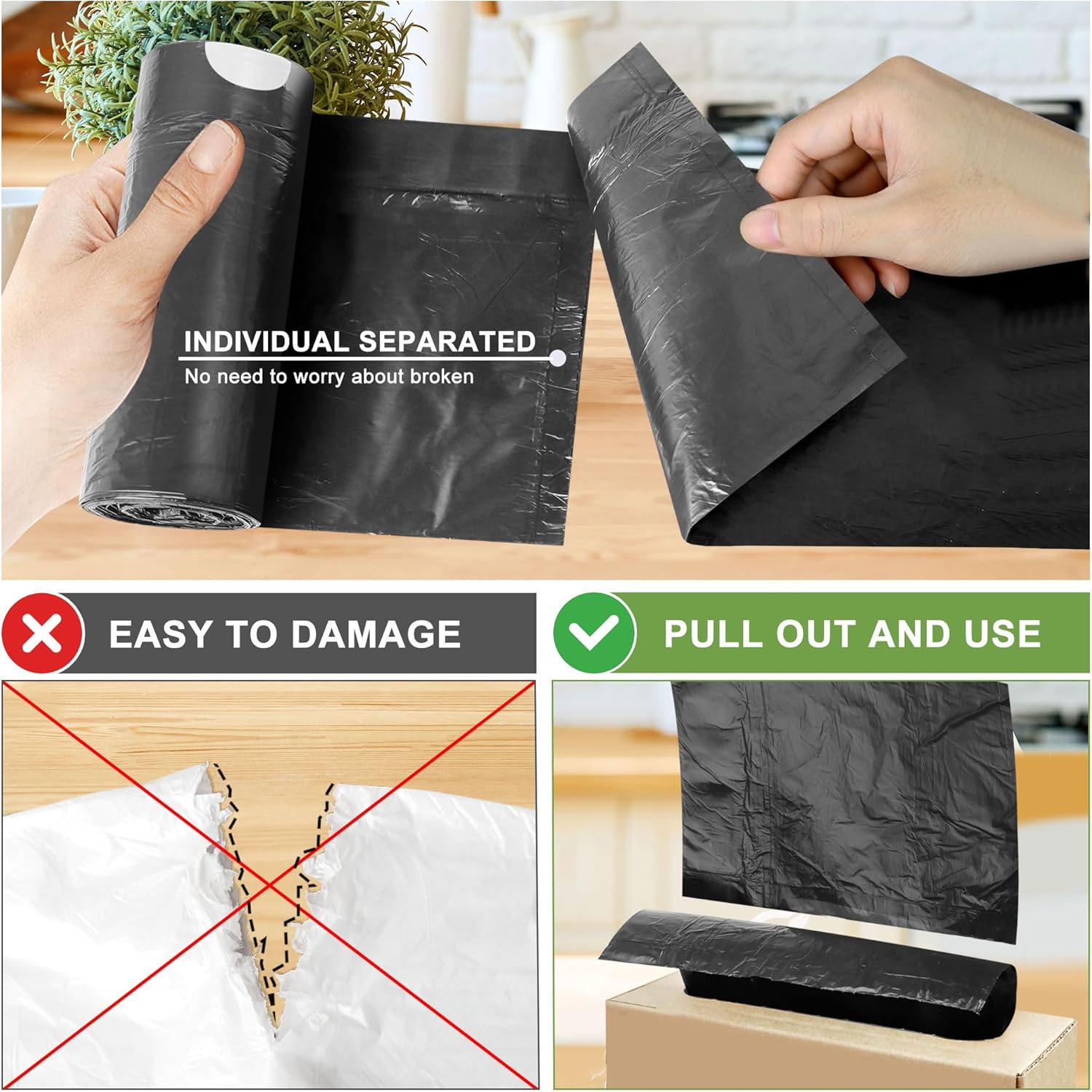 【Unscented and Thick】Garbage bags have no extra smell, so you can use them freely in your bedroom, bathroom, and office. It is a thick garbage bag with enough load-bearing capacity, suitable for 1~2 days of household garbage.