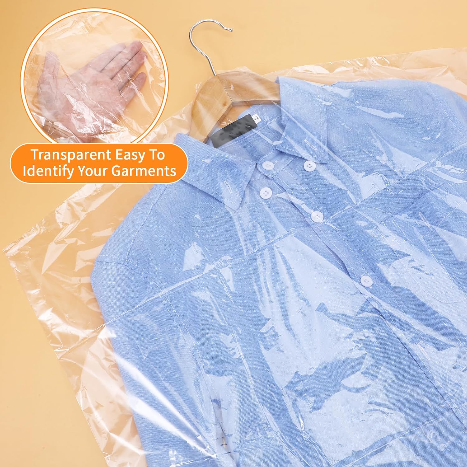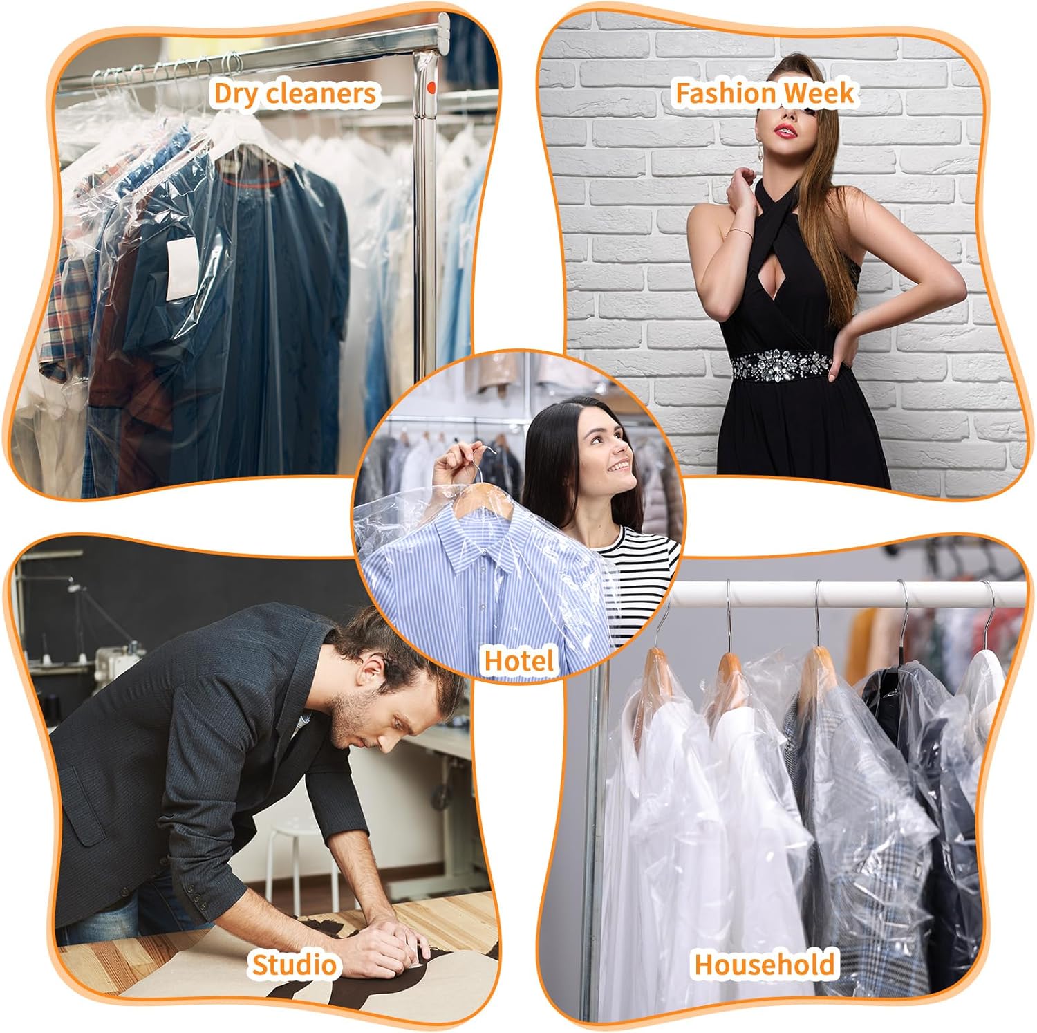 【Wide Application】Plastic dry cleaner bags for hanging clothes are sturdy and reusable, making them a sustainable choice. Use them in your closet, during moving, and for travel. Whether at home, in a tailor shop, or in your retail store, these garment bags are a must-have for anyone who values their clothing investment