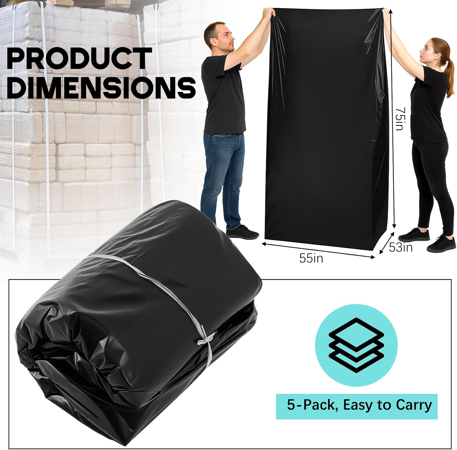 Premium Plastic Material Protection: Crafted from high-quality HDPE (high-density polyethylene), our pallet covers meet the demand for high strength; At 3 mil thickness, they offer robust protection, safeguarding your products from potential damage and ensuring lasting durability