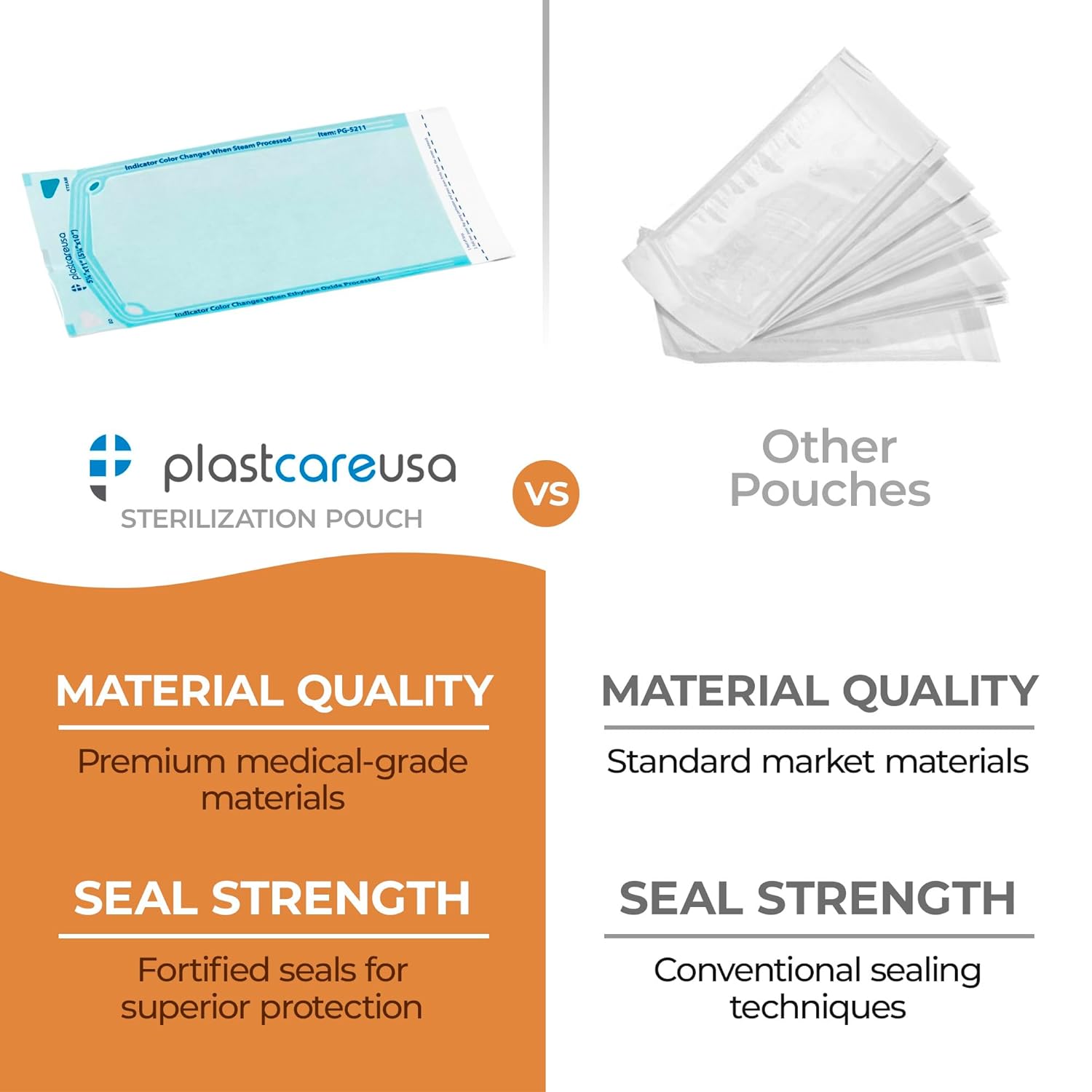 BULK SELF-STERILIZATION BAGS: PlastCare USA provides 1 box of 200 pouches. That makes 200 pouches total to supply your dental office. These sterilizing bags keep teeth cleaning instruments and other dental tools sterilized until their next use. Keep your dental office or lab clean and sterile with these pouches.