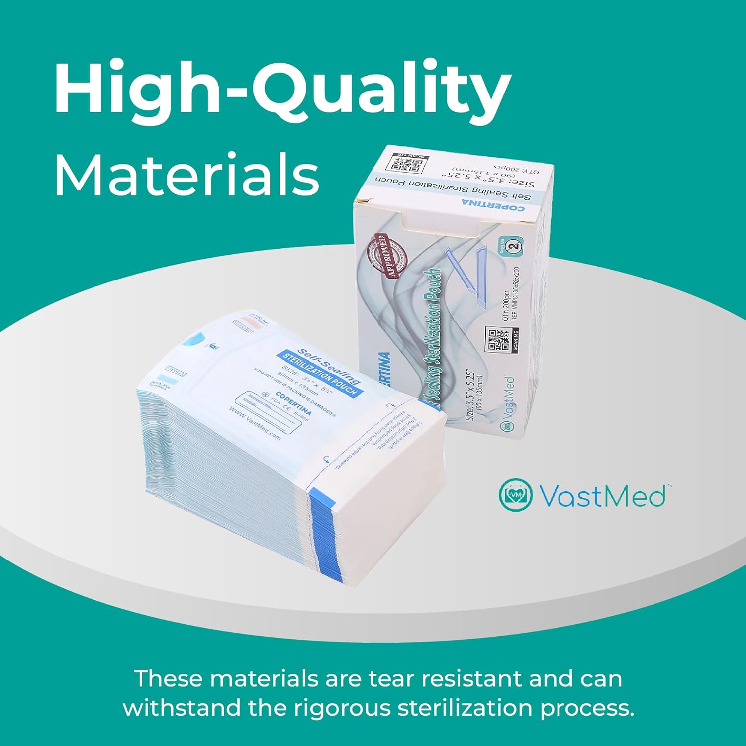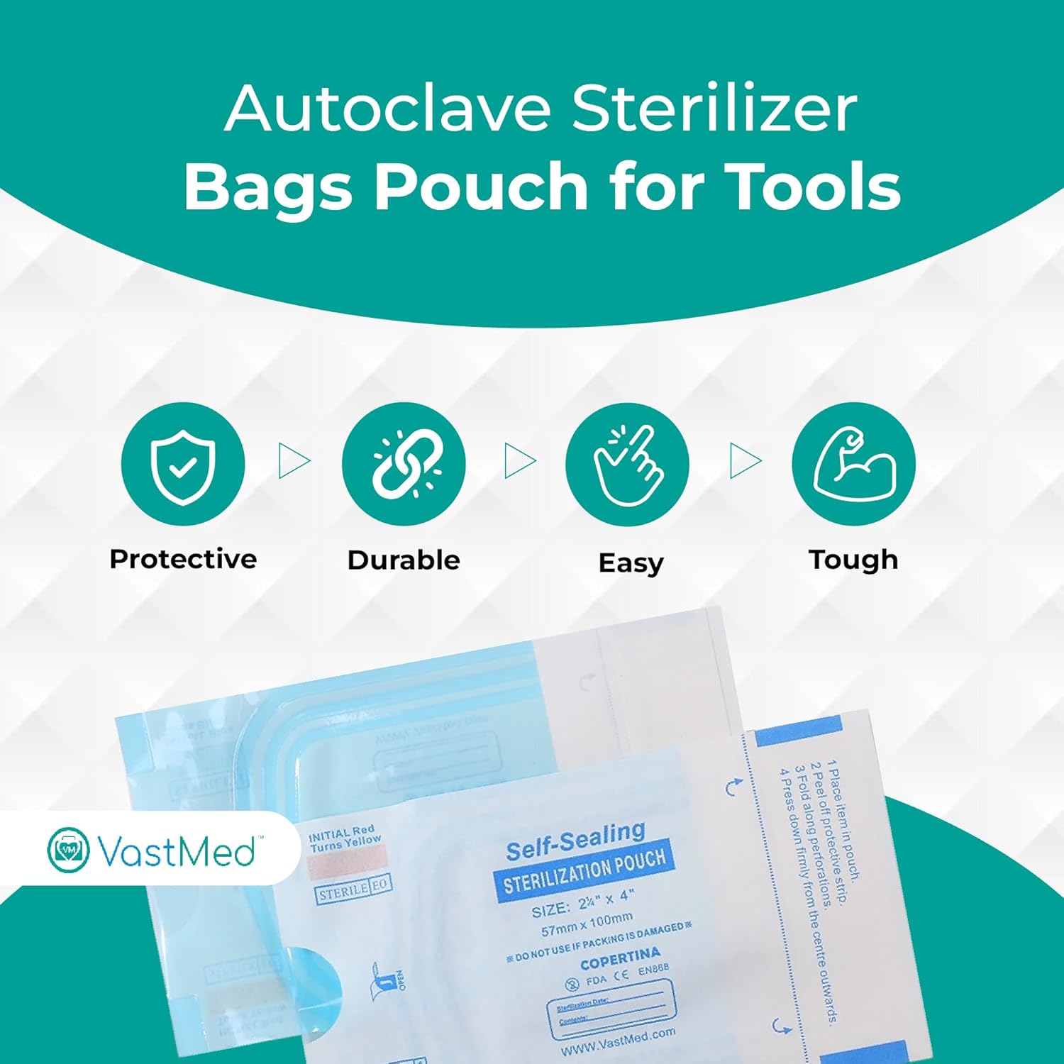 200 Pcs Self Sealing Sterilization Pouches 2.25” x 4” by Vastmed | Dual Indicators Autoclave Sterilizer Bags for Dental Medical Instruments Clean Tools