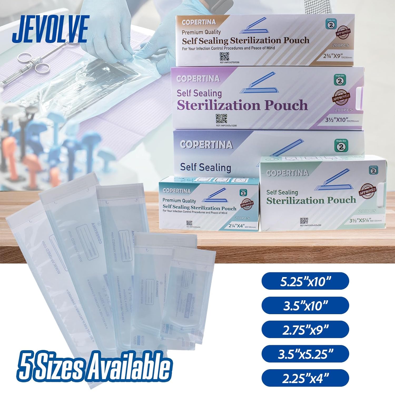 Package Includes – Available in packs of 200, 1000, 2000, 4000, 8000 and 10000 pieces, these self seal sterilization pouches come in white color with a size range of 2.25×4”, 2.75×9”, 3.5×5.25”, 3.5×10” and 5.25×10” — designed to meet professional medical and dental standards.
