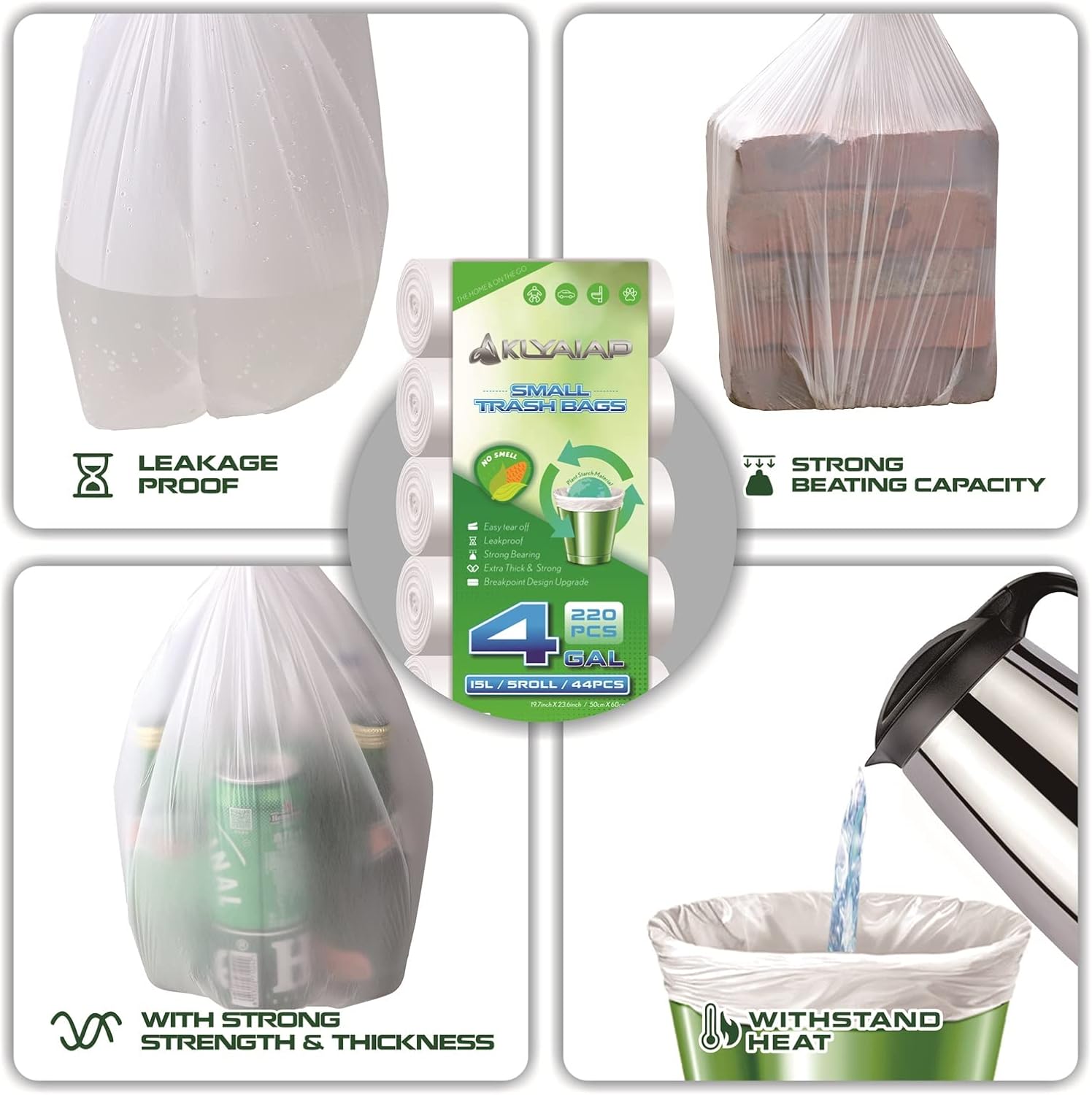 220 Counts Aklyaiap 4 Gallon Trash Bag,Tear & Leak Resistant Bathroom Biodegradable Small Garbage Can Bags Unscented for Home & Kitchen, 5Rolls, White