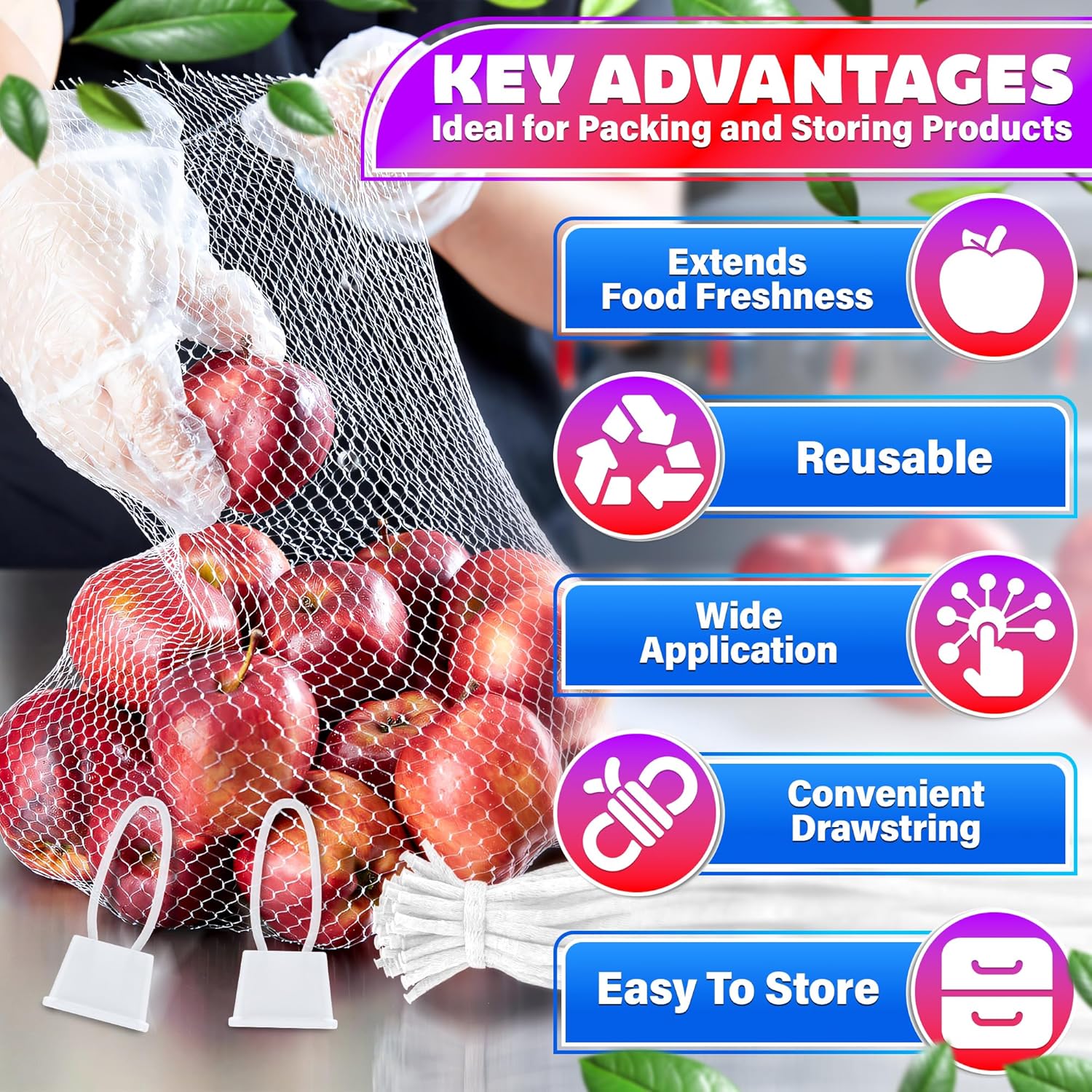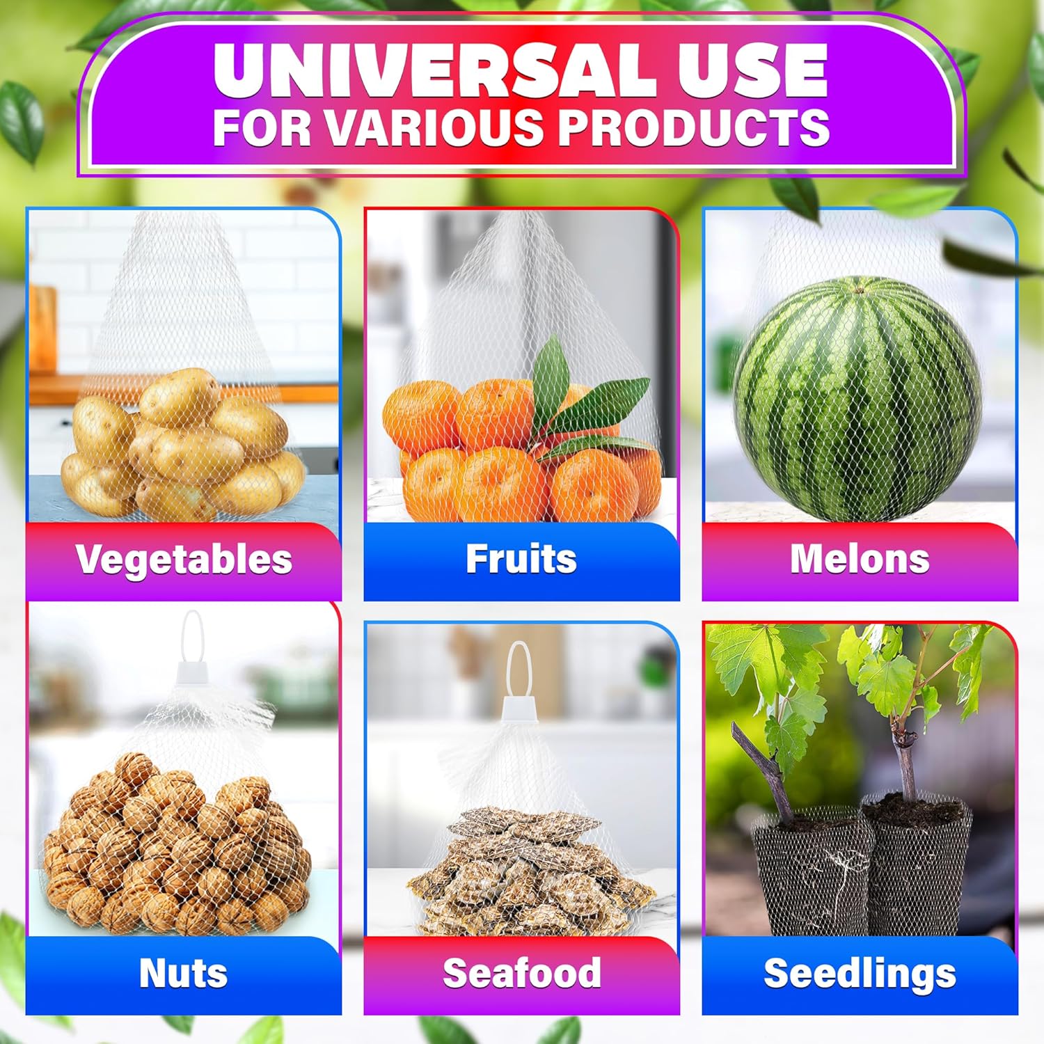 Breathable Produce Mesh Bags: Our vegetable bags to keep fresh are breathable and allow for optimal airflow to keep your fruits and vegetables fresh for longer, reducing single-use plastic bags