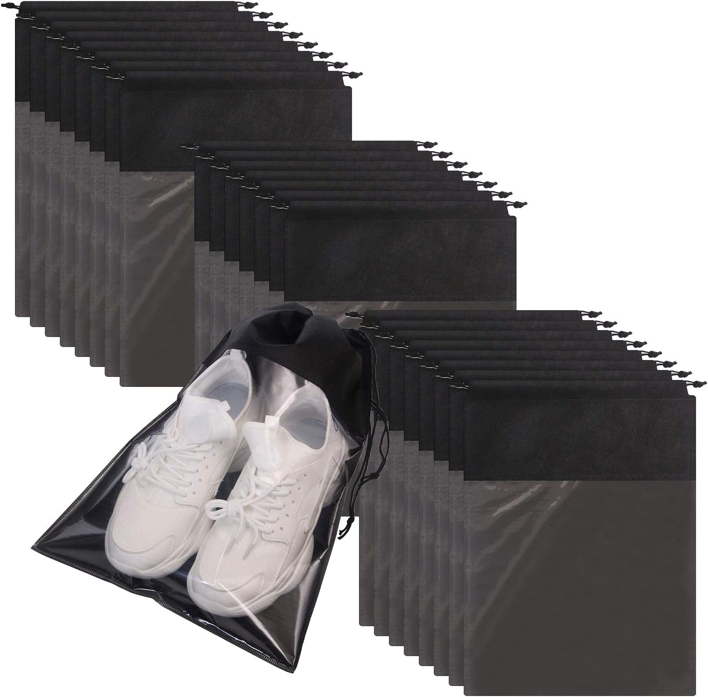 1.【SIZE&COLOR】Set of 24. Color: Black. Large Size: 12.6 inches x 17.3 inches. Perfect size for womens and mens shoes covers. Suitable for Slippers, flip flops, Sandals, leather shoes, dance shoes, kids shoes, hiking tennis golf shoes, purse, clothing, clothes, handbag etc. Ideal for home and travel Use. Separate your dirty shoes from laundry, shirts or other luggage essentials. 2.【STURDY MATERIAL】Made of non-woven fabric with thick rope for convenient organization, durable use. The travel shoe bags has foldable, lightweight and portable, convenient to use. Keeps your shoes well organized and dust free in the closet. 3.【TRANSPARENT WINDOW DESIGN】Easily and quickly identify the content in the Bags. The storage bag helps to keep purses and shoes clean, dust free, and organized. It can be applied as shoes bag for yoga class, running, dancing, exercises, travelling and so on. 4.【FUNCTIONAL & VERSATILE】 Not only fit for sneakers, dress shoes, high heel shoes and sandals, laundry, shirts, and many other luggage essentials; Also can be used as makeup bag, shoe accessories, space saving traveling bags, toiletry bag, packing bags, gym accessories, laundry bags travel, show bags, sport bags, drawstring christmas gift bags, carrying shoes storage organizer bag and for other uses. 5.【TRAVEL ACCESSORIES】These travel bags is great for travel! It helps you packing luggage conveniently and quickly, you don’t have to dig around for what you need. With these shoe bags, you can maximize your suitcase space.
